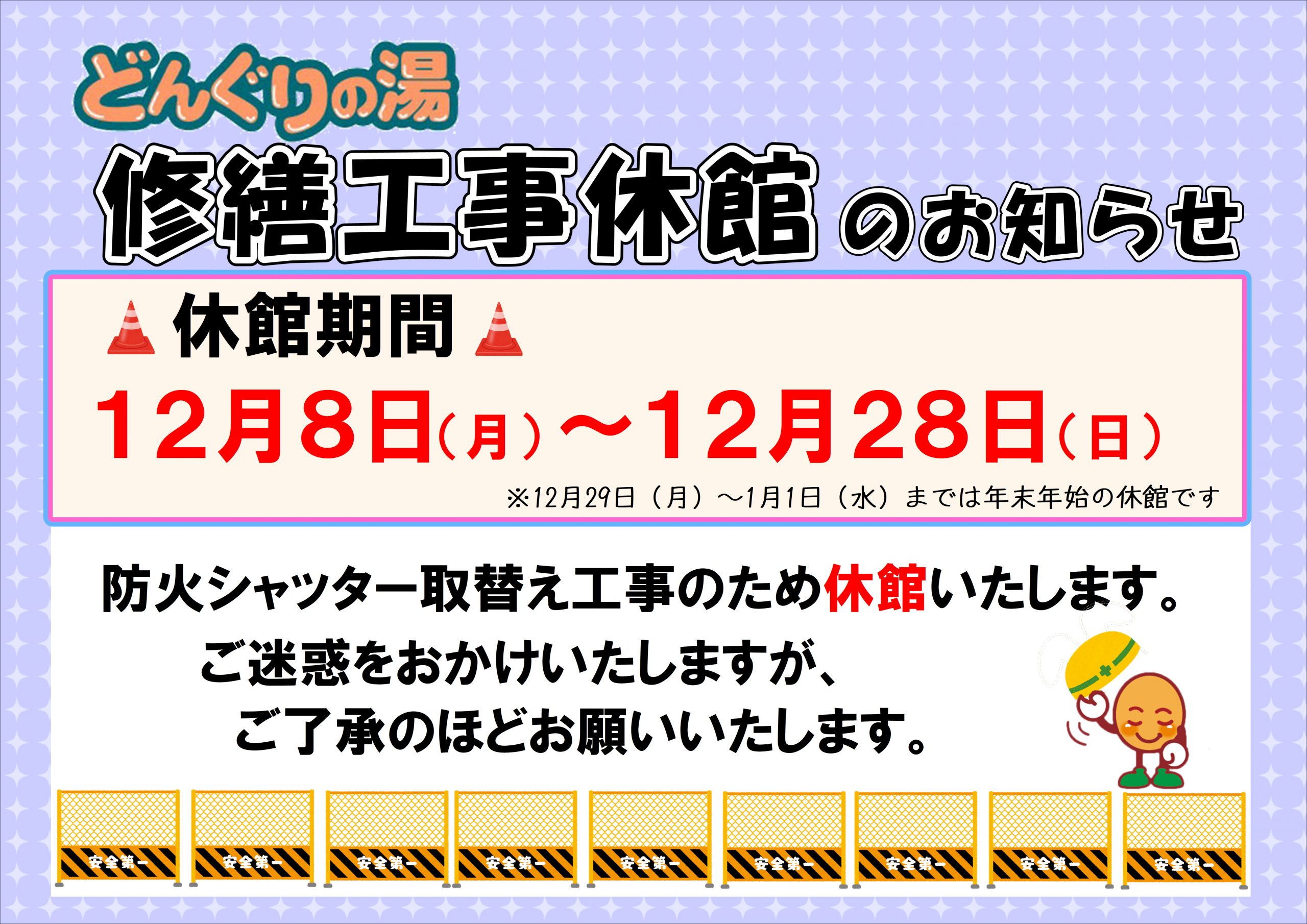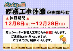 12月8日(月)~防火シャッター取替え工事のため、休館いたします。 ご迷惑をおかけいたしますが、ご了承のほどお願いいたします。